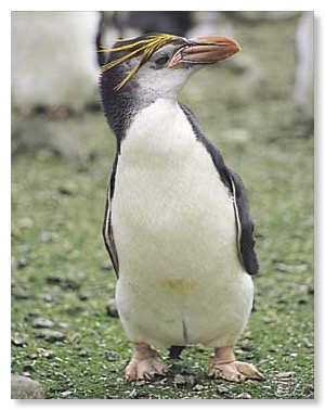 In contrast to the other crested penguins, Royal (and Macaroni) Penguins have orange, not yellow, feather plumes. They originate from a supercilium that meets at the front; i.e. higher up the head than in other species. These penguins are also slightly larger than the other crested penguins. Royal Penguins breed on Macquarie Island and most have a white face. Immatures are similar to adults but lack the long feather crest. Instead only a short orange-yellow supercilium is present.